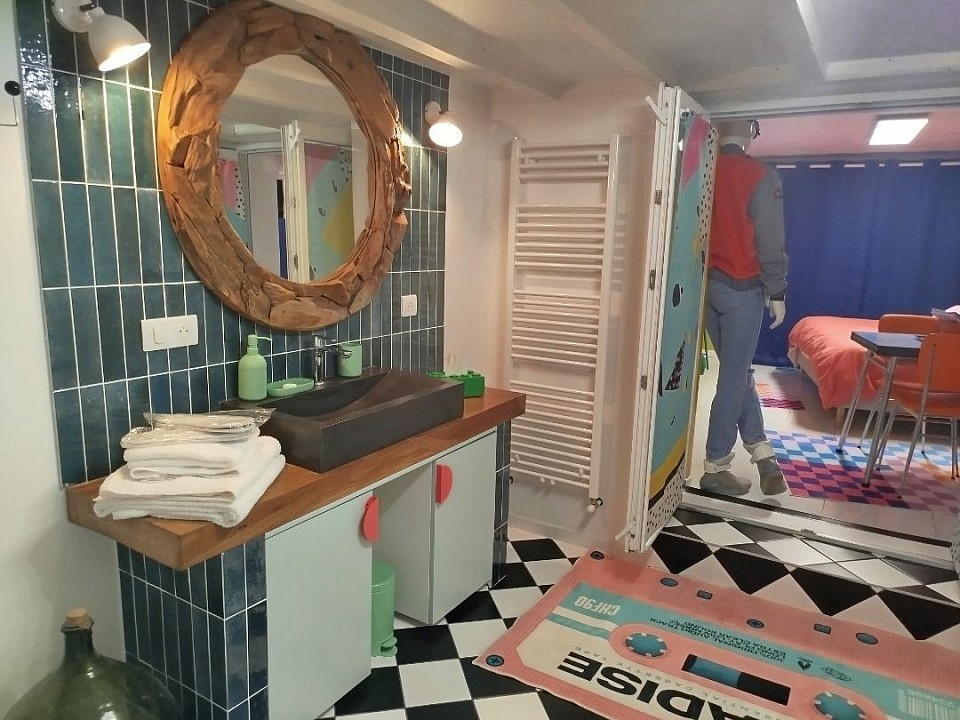 Située au RDC d'une maison indépendante avec un accès totalement privé, cette suite unique composée d’une chambre spacieuse et d’une grande salle de bain vous promet une parenthèse ludique et colorée.
